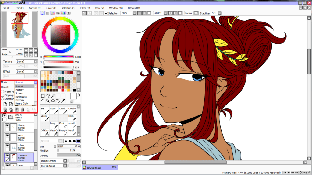 La fonction preserve opacity permet quant à elle de « figer » la couleur d’un calque, permettant de la travailler par exemple pour lui donner d’autres nuances. C’est utile pour modifier la couleur de votre lineart/ encrage sans effort par exemple.